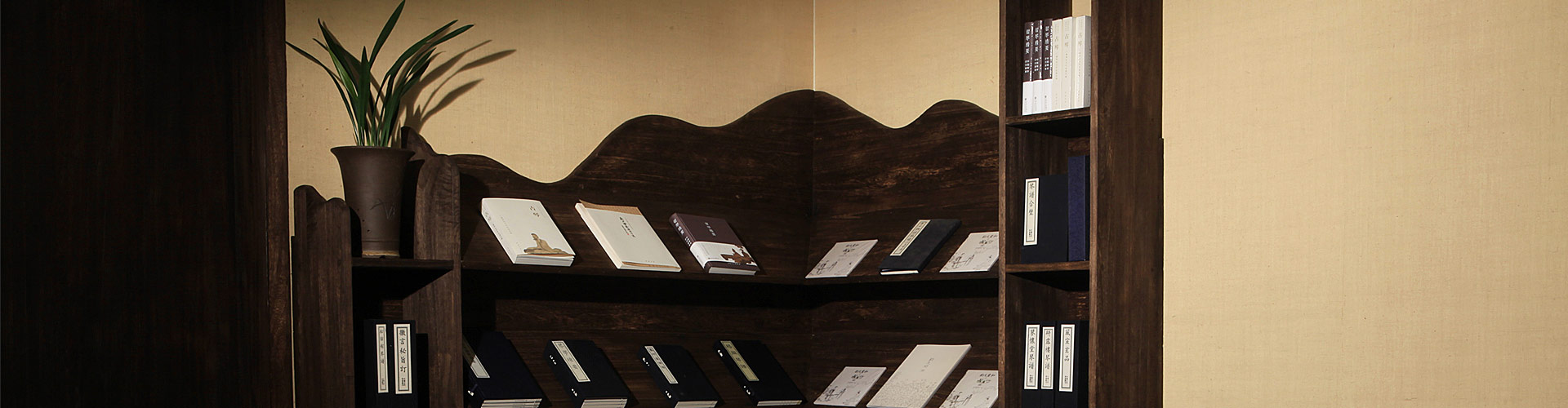 此款书架依据室内拐角处的空间设计,具有储存、展示和装饰的综合功能。中间主体部分为三层斜面搁板,用以平面展示书籍文献,搁板底部均出有立体棱边,可阻止书本滑落令安放无忧;两侧配置有高低不同的置物层架,方便分类存放书籍;层架与书架主体整体相连,贴墙的背板以山体为概念在墙面勾画出山峦起伏的轮廓,不仅隐藏了室内拐角的硬线,同时美化了墙面,使之与室内环境有机结合,更令人超越室内空间引发对自然情致的想象。