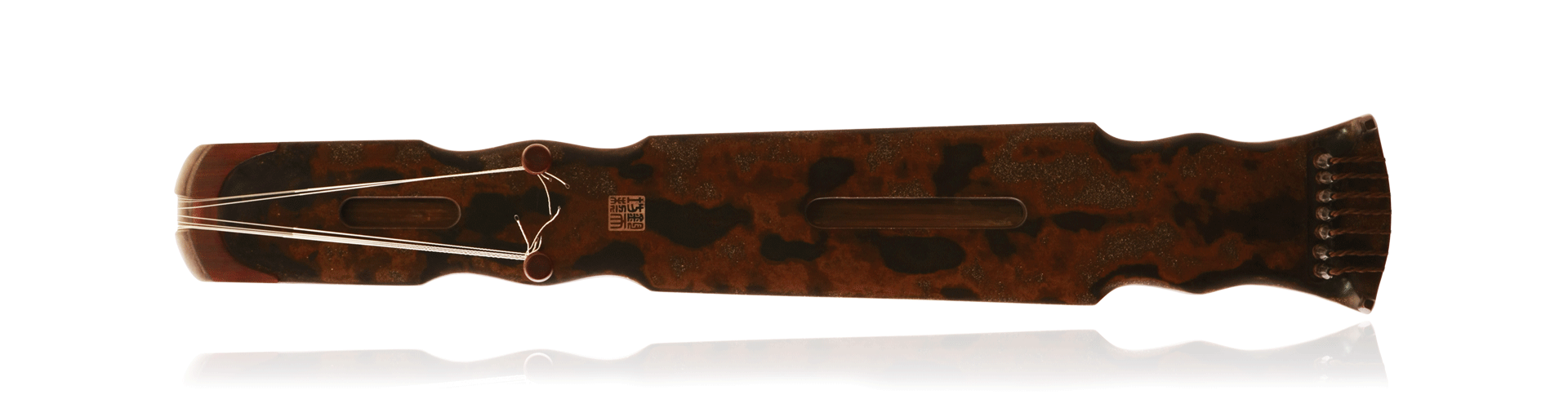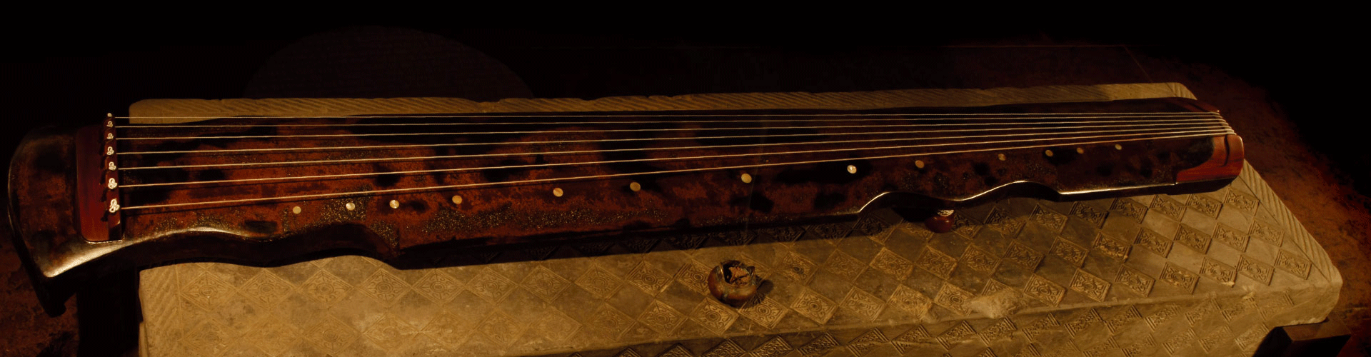 宋琴“松石间意”,原系清宫旧藏,亦是清乾隆帝最为喜爱的一张琴。其“项与腰皆作凹入半月形,相交处复作凸出半月形,通体极长大,池沼皆长方”。(《琴学随笔》)此琴在2010年北京保利秋季拍卖会上以1.3664亿元拍出,创造了世界古琴拍卖纪录,同时也创造了世界乐器拍卖纪录。钧天坊制“松石间意”,造型如初,制作精美,黑漆中隐显红光,小冰裂牛毛断纹,继承了原琴的“其音清穆,其德渊懿”的音色,亦如同乾隆御题诗所言“古锦囊轁龙门琴,朱弦久歇霹雳音”,声若霹雳又不失和净。