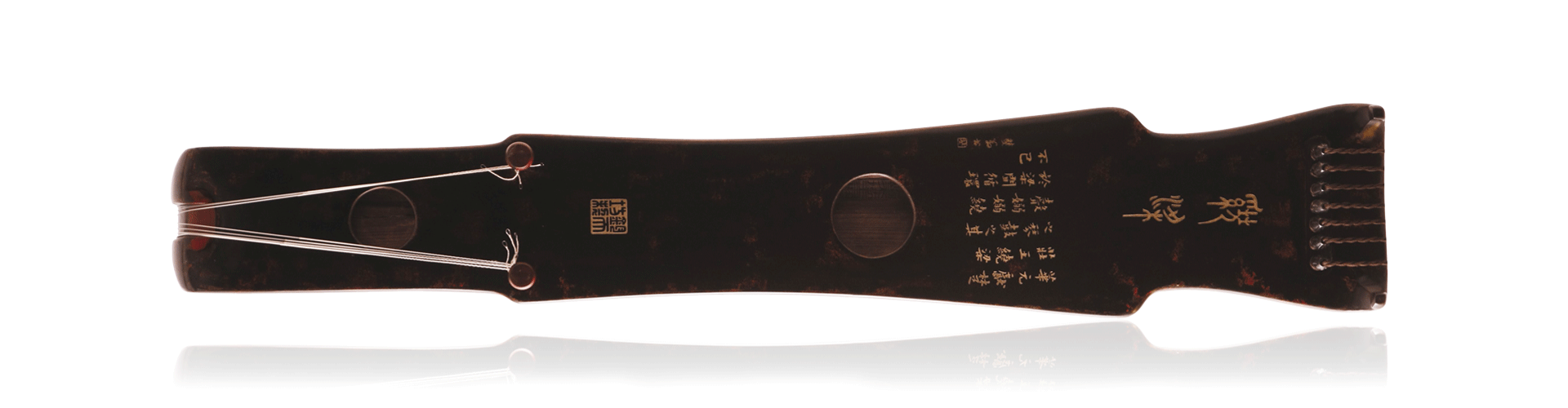 “绕梁”琴肩颈特色与时人相仿,颈短且二徽起肩,曲线唯美雅致,造型流畅跌宕。明代杉木为面,髹以传统大漆灰胎,散嵌朱光。琴名以金文大篆书写,以显其高古之风。龙池凤沼皆为浑圆,琴声清润,音色绵延,弥久回环,只且轻奏,于不同音区间游走,余韵萦绕不断,正如铭文所述“其声嫋嫋,绕于梁间,循环不已”,更可感“余音绕梁,三日不绝”之绝妙佳境。