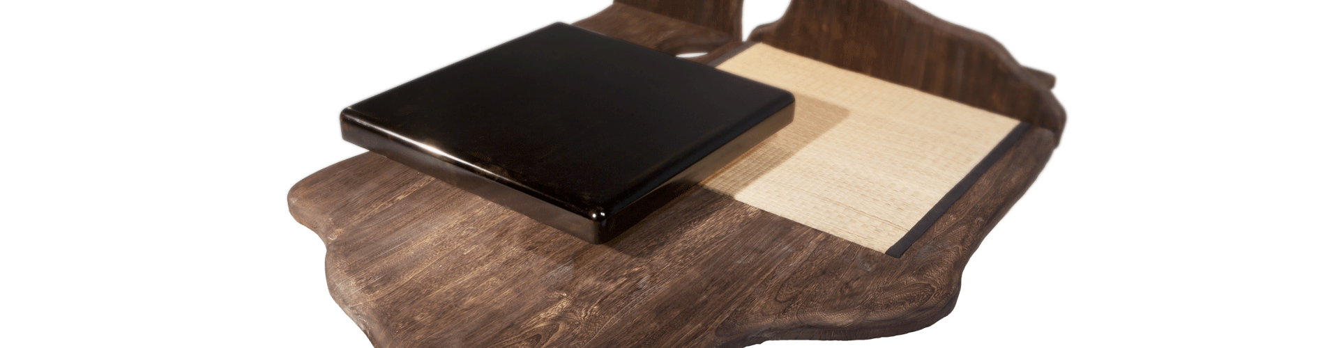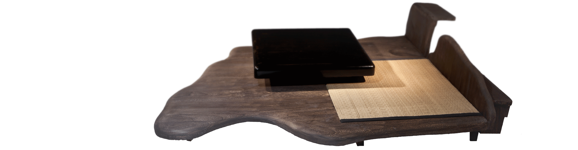 此组茶台以榻榻米与金砖茶歇为主要元素。贴墙一侧有云朵状面板与茶台主体相连;茶台主体以席地风格为主,托底板材为圆润流畅的自然云形,起地较低,台面木板内嵌榻榻米,清新整洁;上设金砖茶台,与朴拙的木质、静雅的榻榻米形成材质的对比与混搭;木材、细草的清香与清冷浑厚的金石相映成趣,围坐案旁品茶清谈,茶韵与禅意悠然溢出。