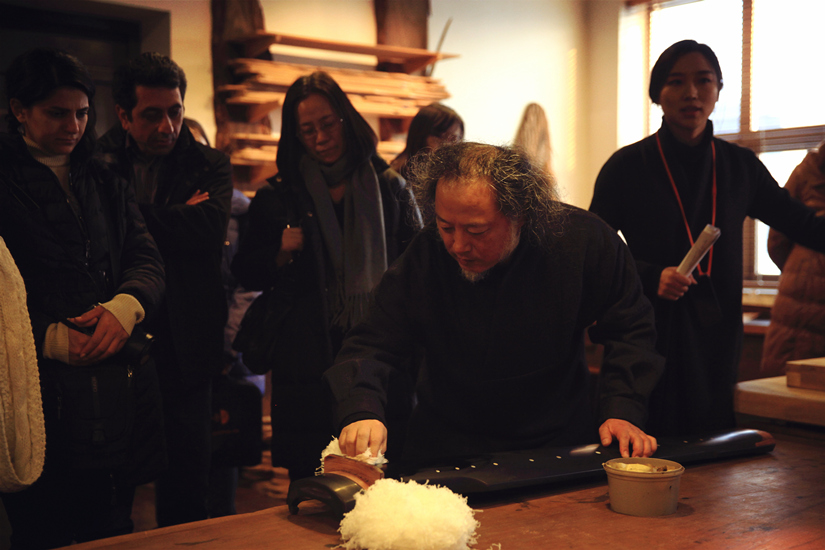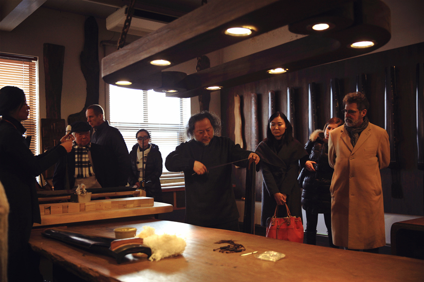 王鹏先生在其工作室为大家亲自演示了古琴制作,详细地解释了古琴的选材用料、发音上弦等问题。