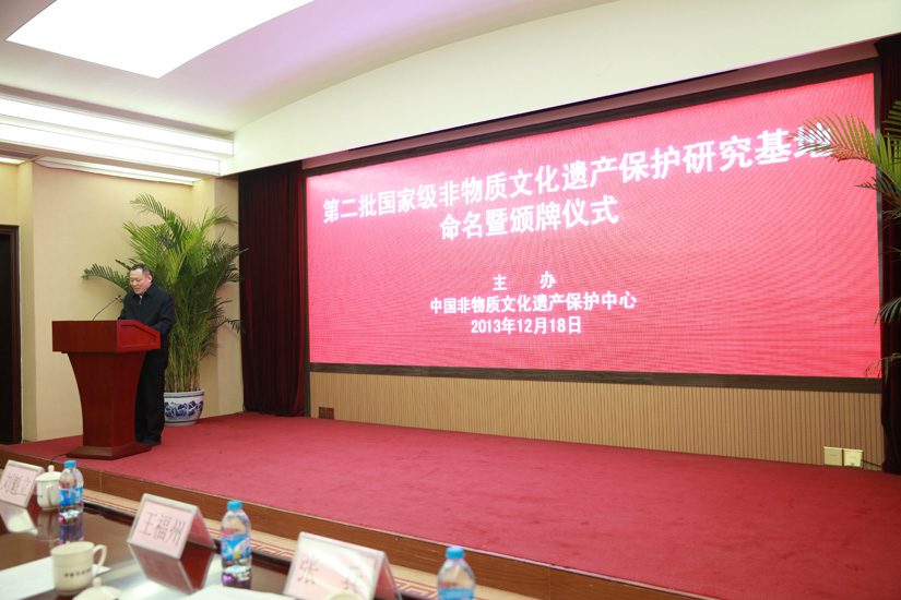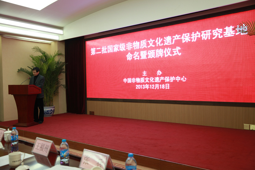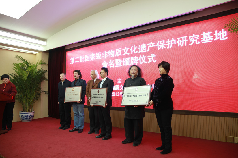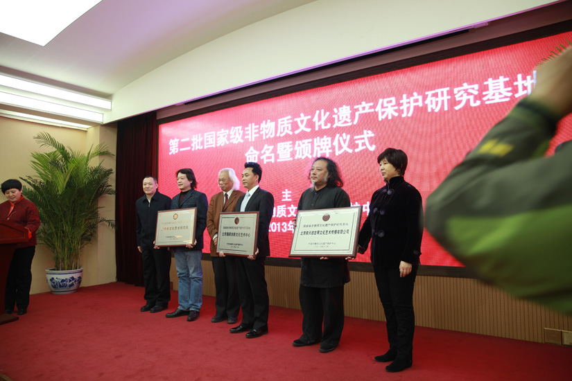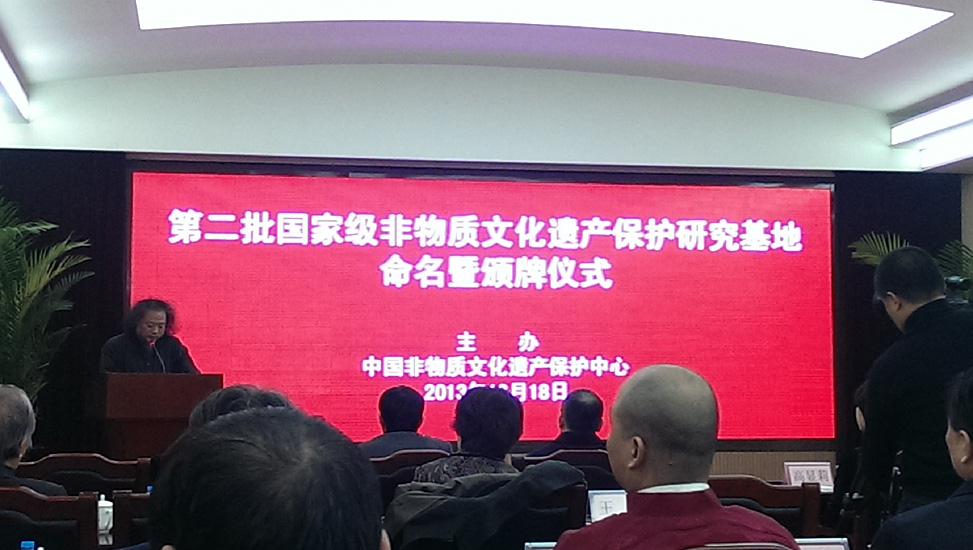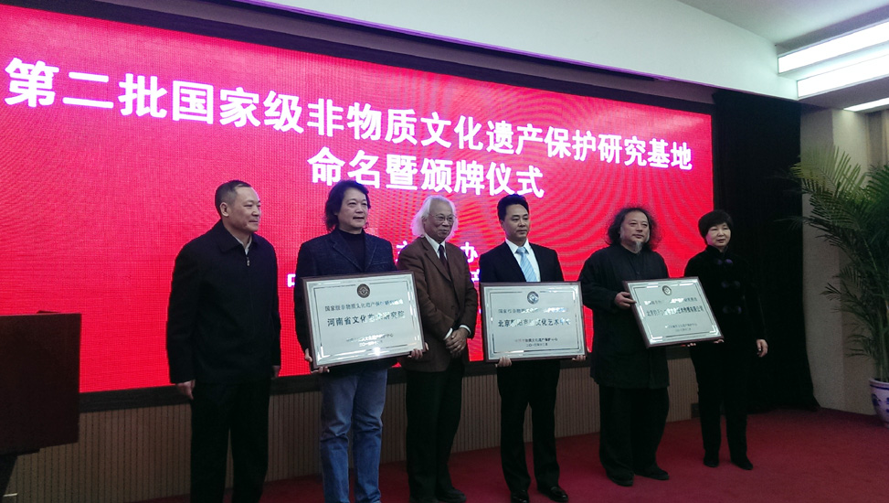 2013年12月18日, “第二批国家级非物质文化遗产保护研究基地命名暨颁牌仪式”在中国非物质文化遗产保护中心(中国艺术研究院)举行。中国非物质文化遗产保护中心常务副主任罗微主持会议,文化部非物质文化遗产司司长马文辉、副司长马胜德、王福州,中国艺术研究院党委书记、副院长高显莉,中国艺术研究院副院长牛根富,中国非物质文化遗产保护中心专家委员会副主任刘魁立等专家和领导出席了会议。文化部非物质文化遗产司司长马文辉, 钧天坊非遗传承人王鹏,专家代表刘锡诚等做了主题讲话。
