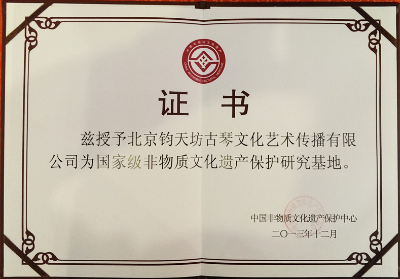 获此“保护研究基地”称号以后,钧天坊将以古琴文化为核心,结合传统艺术形式与当代艺术精神,在全国甚至全世界建立一个中国的传统文化体验空间,希望通过琴、书、画、茶、花、香的艺术语言,继续将文人的美学观与生命态度融入生活,立体地呈现给大家。为净化文化环境、净化人的心灵,为社会形成热爱文化、尊重艺术的良好社会风气,为传播“中正平和”的正能量而尽绵薄之力。让每个人在感受钧天坊的同时,能对各自领域有所启发,有所感悟,对当代社会生活产生正能量的传递与影响,实现大爱与和平,这是钧天坊不变的理想。
