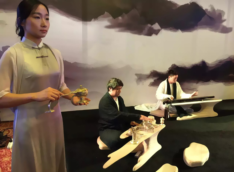 在丝路明珠展示活动中,钧天坊创始人、斫琴艺术家王鹏与中国民俗学会-中国香文化研究中心主任、松风中国传统文化研究会会长孙亮,以及钧天云和乐团的青年艺术家们,为与会嘉宾做了琴茶花香中国传统文化的展演。现场互动体验非常热烈,与会嘉宾无不被鲜活的、博大精深的中国传统文化所倾倒。