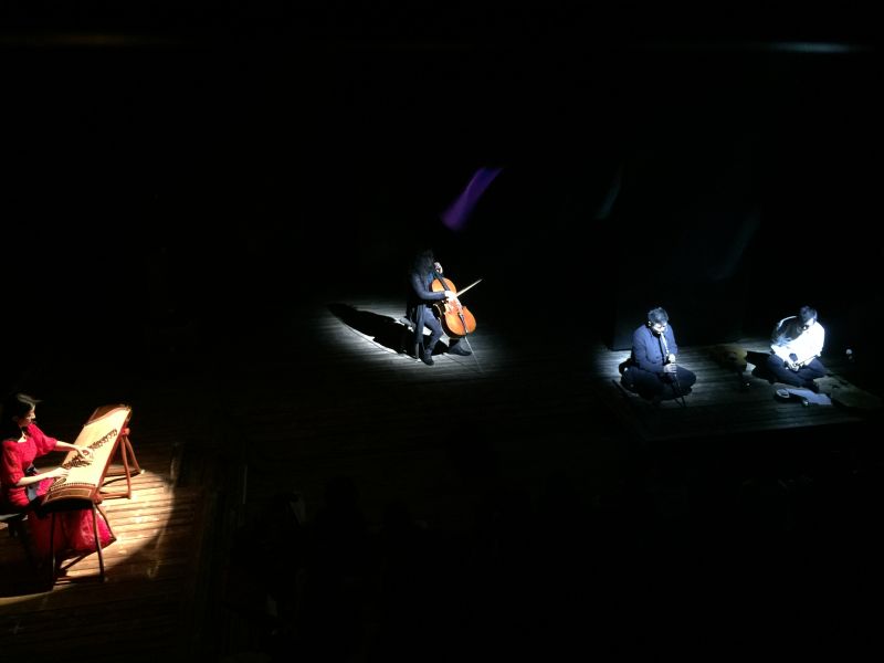 及至全场黑暗,随着一声声清脆如铃音般的音乐,之前怀抱吉他的歌者手握拇指琴营造空灵,再次与箫、大提琴相呼应,时而低吟,时而高亢,让人的身体跟随着音乐情绪而穿行,而放空。